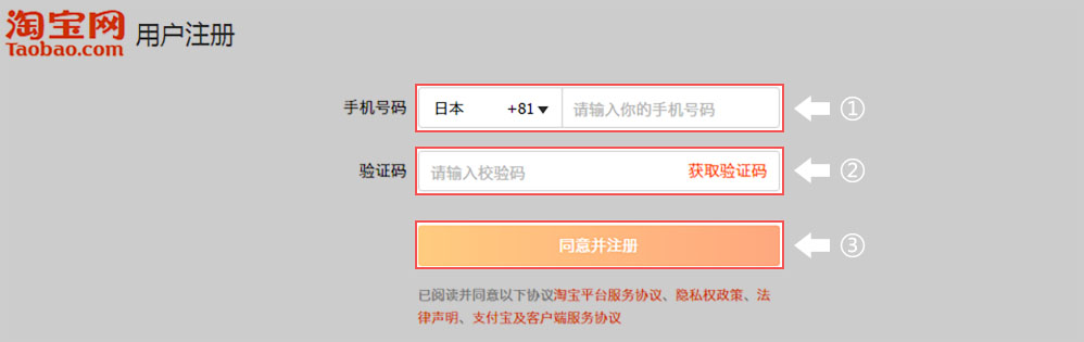 ②認証コードを入力し、「同意并注册」ボタンをクリックします。